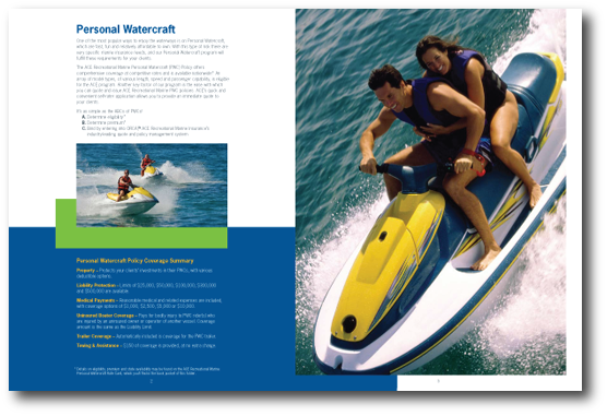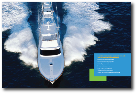 ACE Recreational Marine Insurance, a division of ACE USA, offers recreational marine insurance products. We have built a strong brand for ACE Recreational Marine creating everything from ads and fact sheets to complete capabilities packages. The pocket of their capabilities brochure holds individual fact sheets providing details about specific products that can easily be updated without reprinting the entire brochure.
